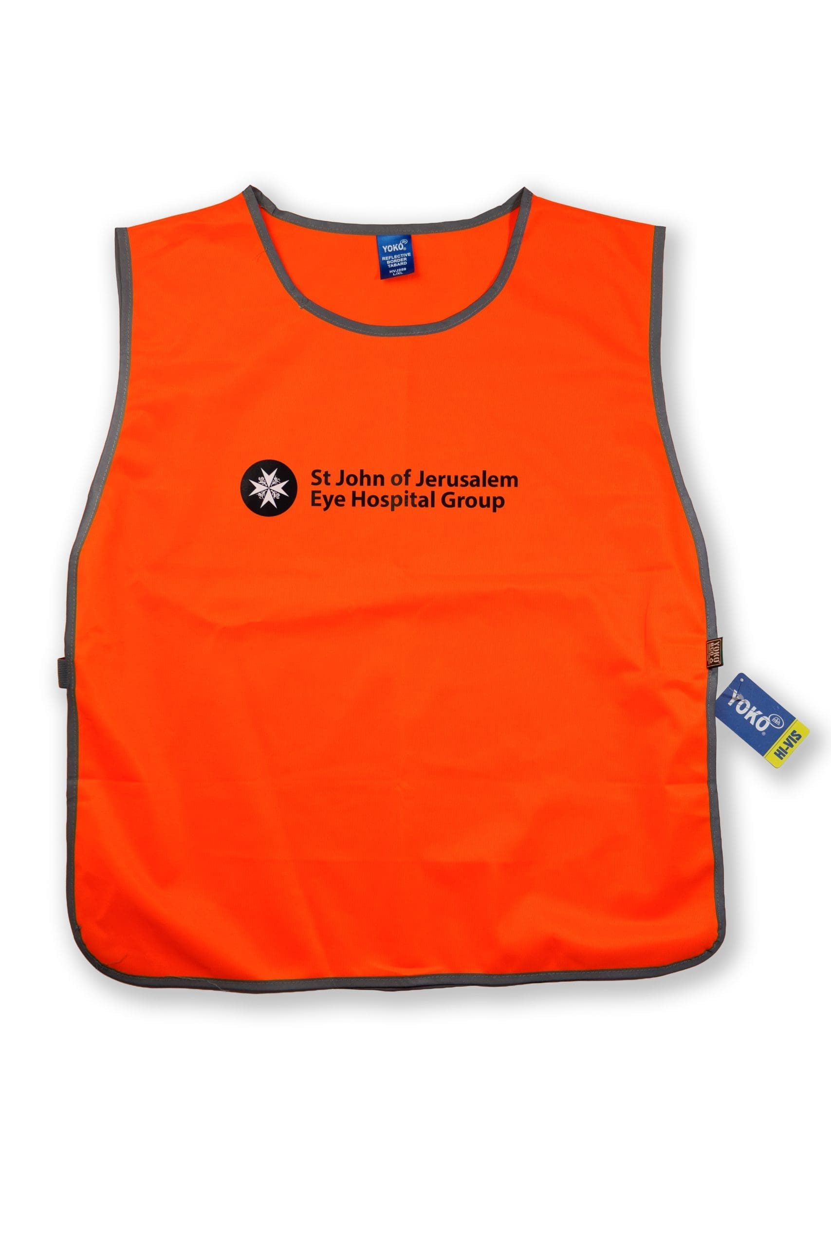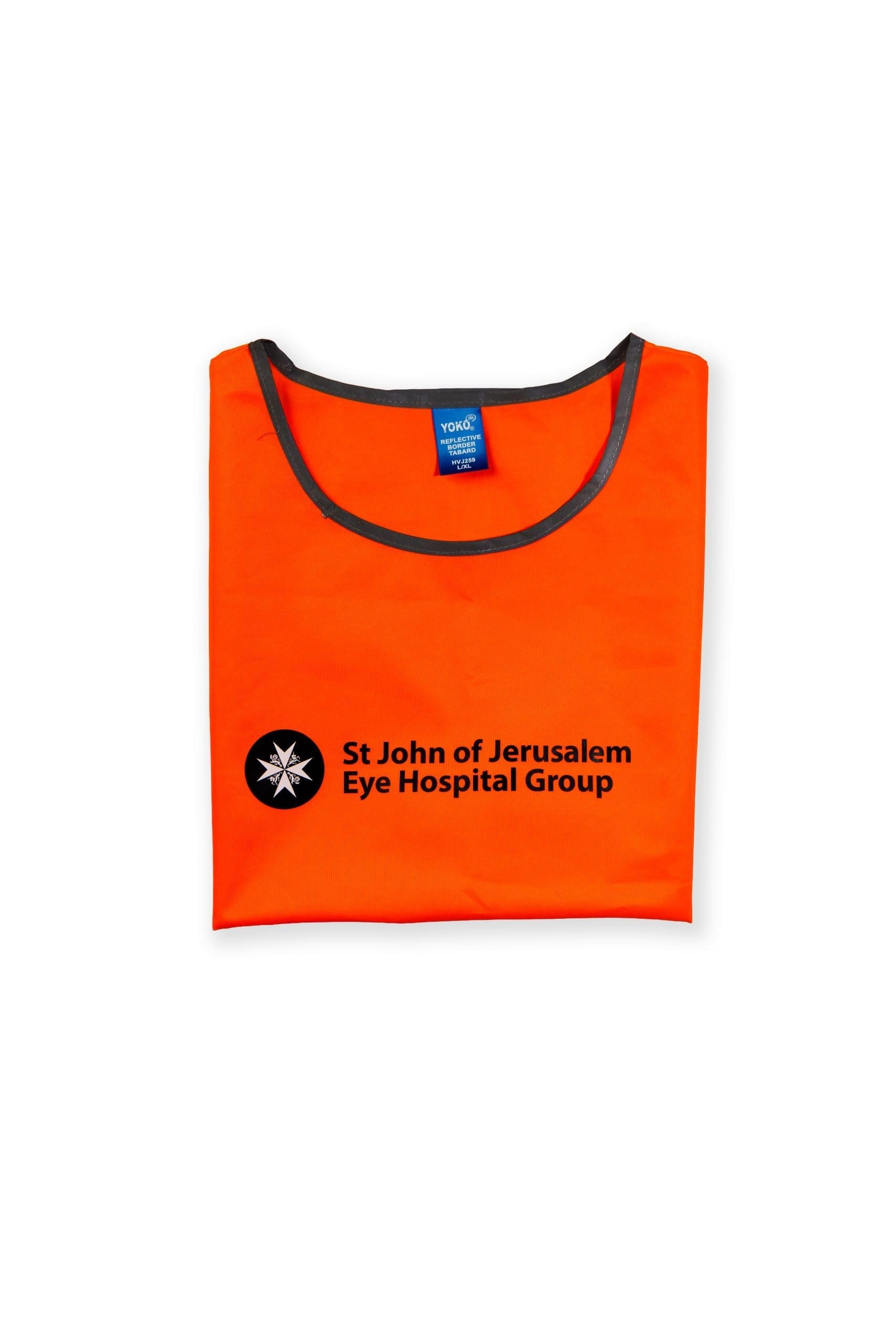 Unisex one-size bright orange tabard for use at fundraising events. Branded with SJEHG logo.